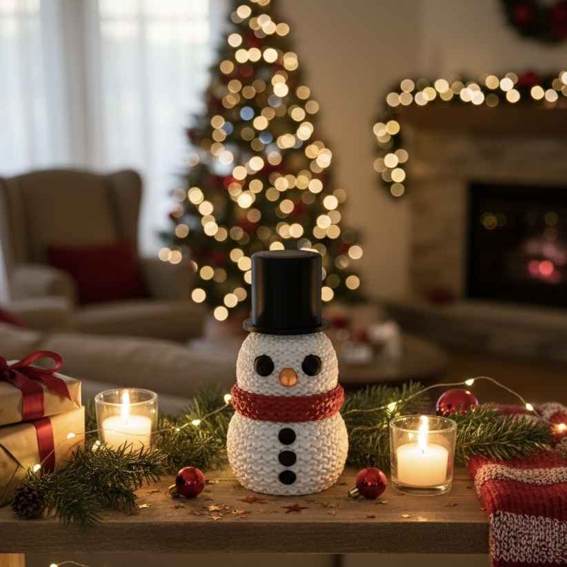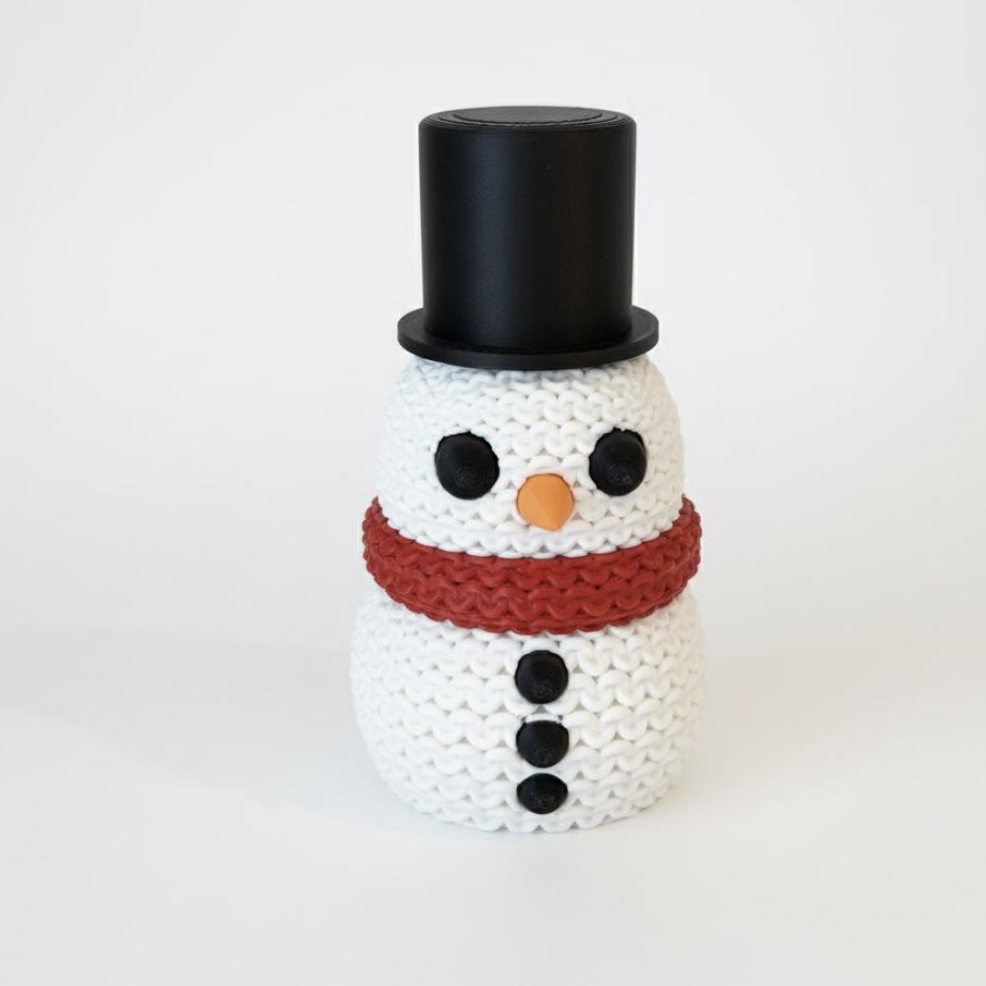 Este simpático muñeco de nieve combina la calidez de lo hecho a mano con la innovación de la impresión 3D. Fabricado en PLA biodegradable, su textura imita el punto tejido, logrando un acabado tierno y acogedor que transmite todo el espíritu navideño.
